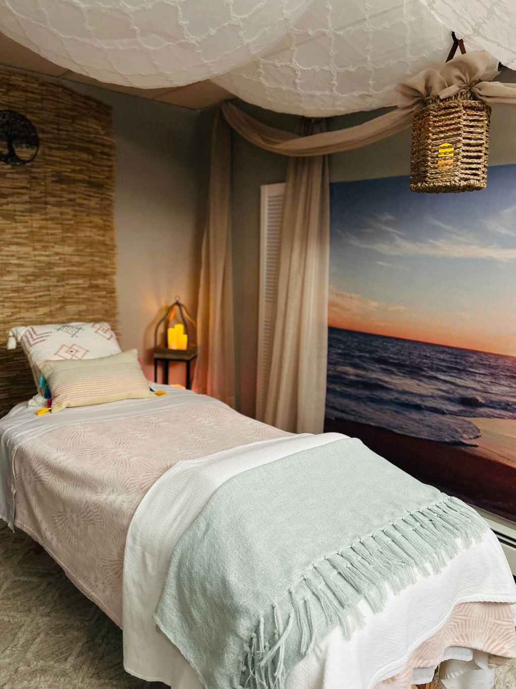 The Relaxation Resort Room takes you to an exotic location where you will receive a massage in a cabana with an ocean view while listening to waves set to music that beckons you to forget you're still in Indiana.
